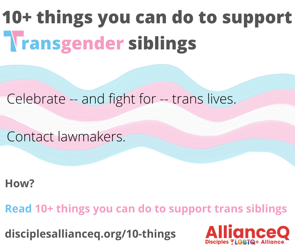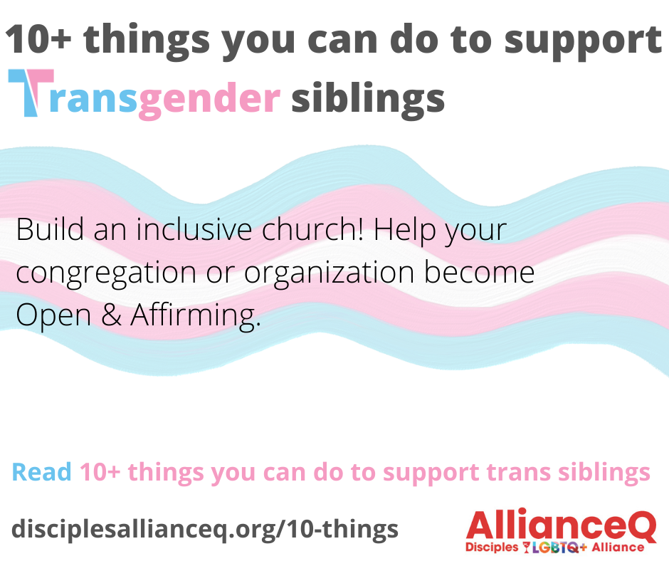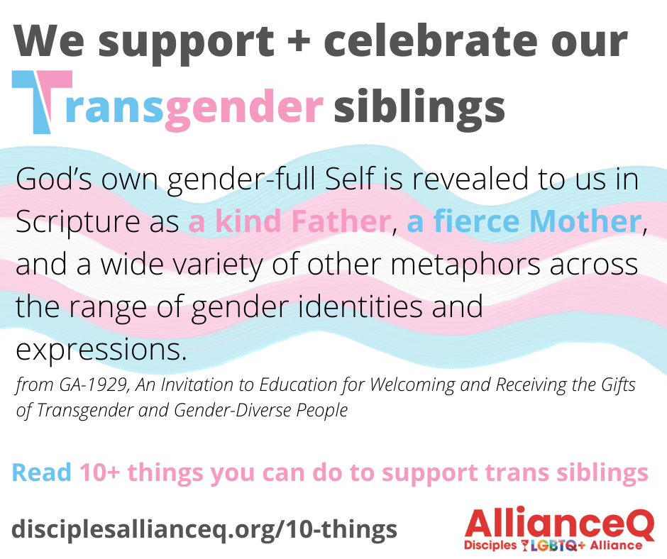 - Review the church’s 2019 resolution GA-1929 “An Invitation to Education for Welcoming and Receiving the Gifts of Transgender and Gender-Diverse People.” [2] Talk about this in your faith community!