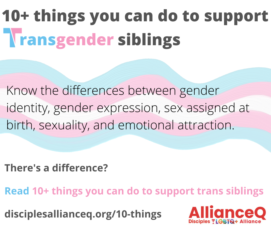 - Know the differences between gender identity, gender expression, sex assigned at birth, sexuality, and emotional attraction. Watch our “Transgender 101: The ‘T’ in LGBT” webinar recording. Request the video and PowerPoint slides here. Click here for specifics about the Trans 101 recording.