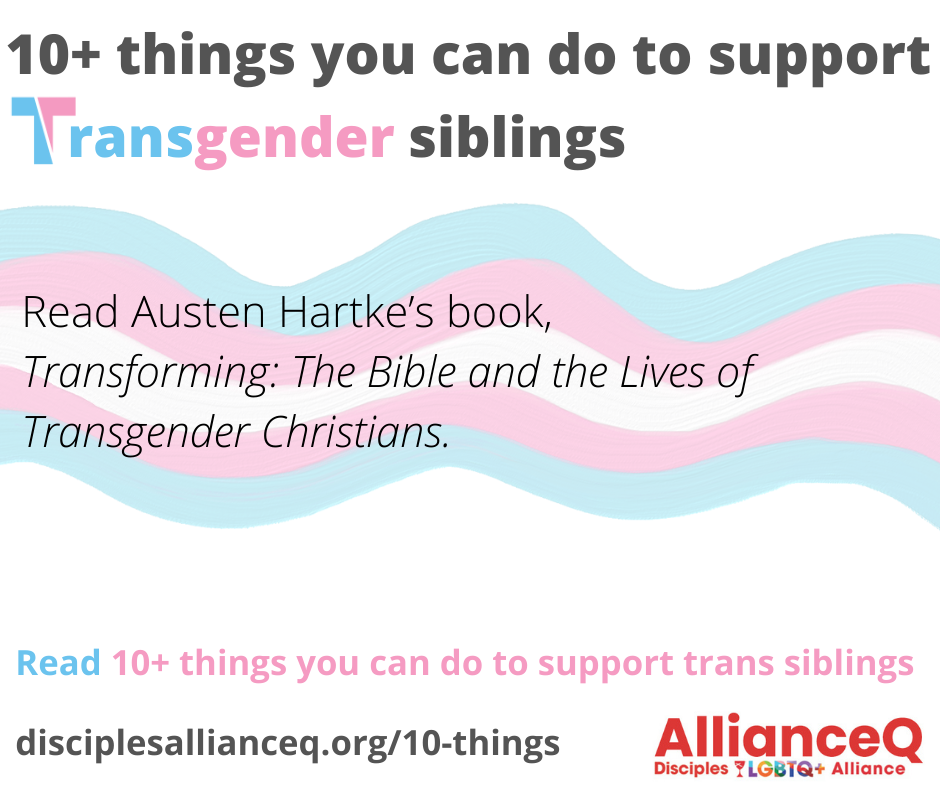 - Read Austen Hartke’s book, Transforming: The Bible and the Lives of Transgender Christians. Austen is the founder of the Transmission Ministry Collective. (He also endorsed Colors of Hope: A Devotional Journal from LGBTQ+ Christians.)