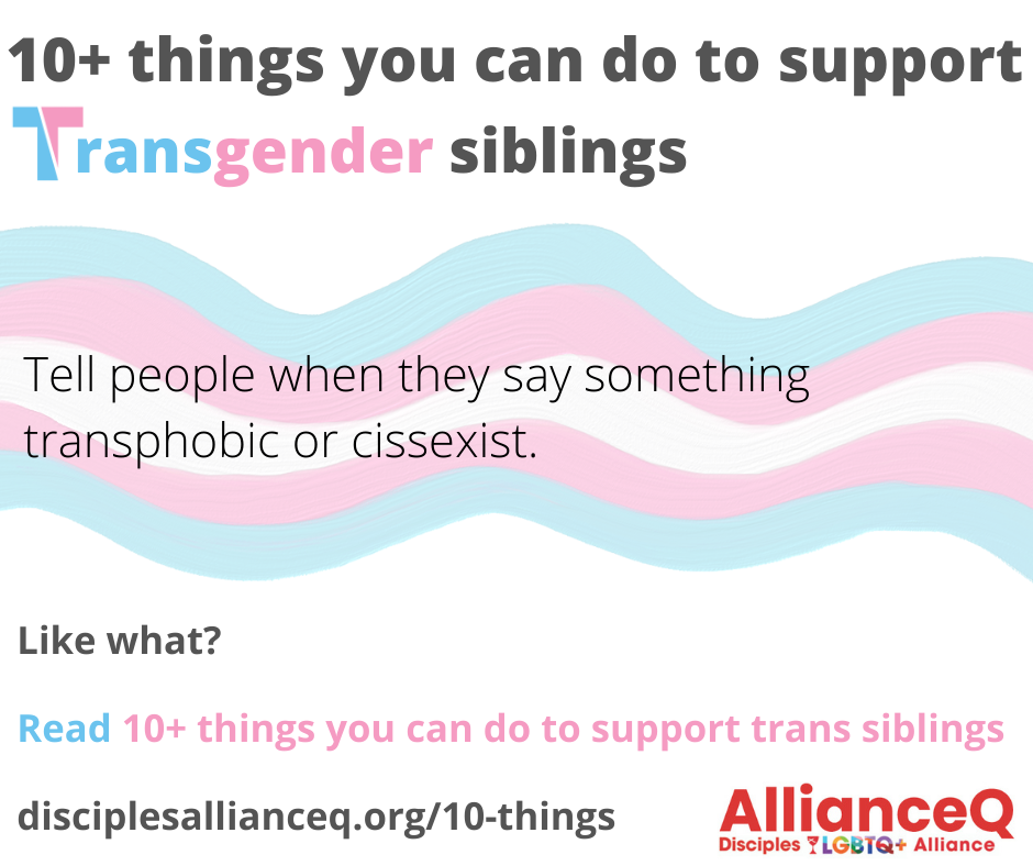 - Tell people when they say something transphobic or cissexist. This may be calling out, calling in, or a different form of recognition. Accountability is vital for our community!